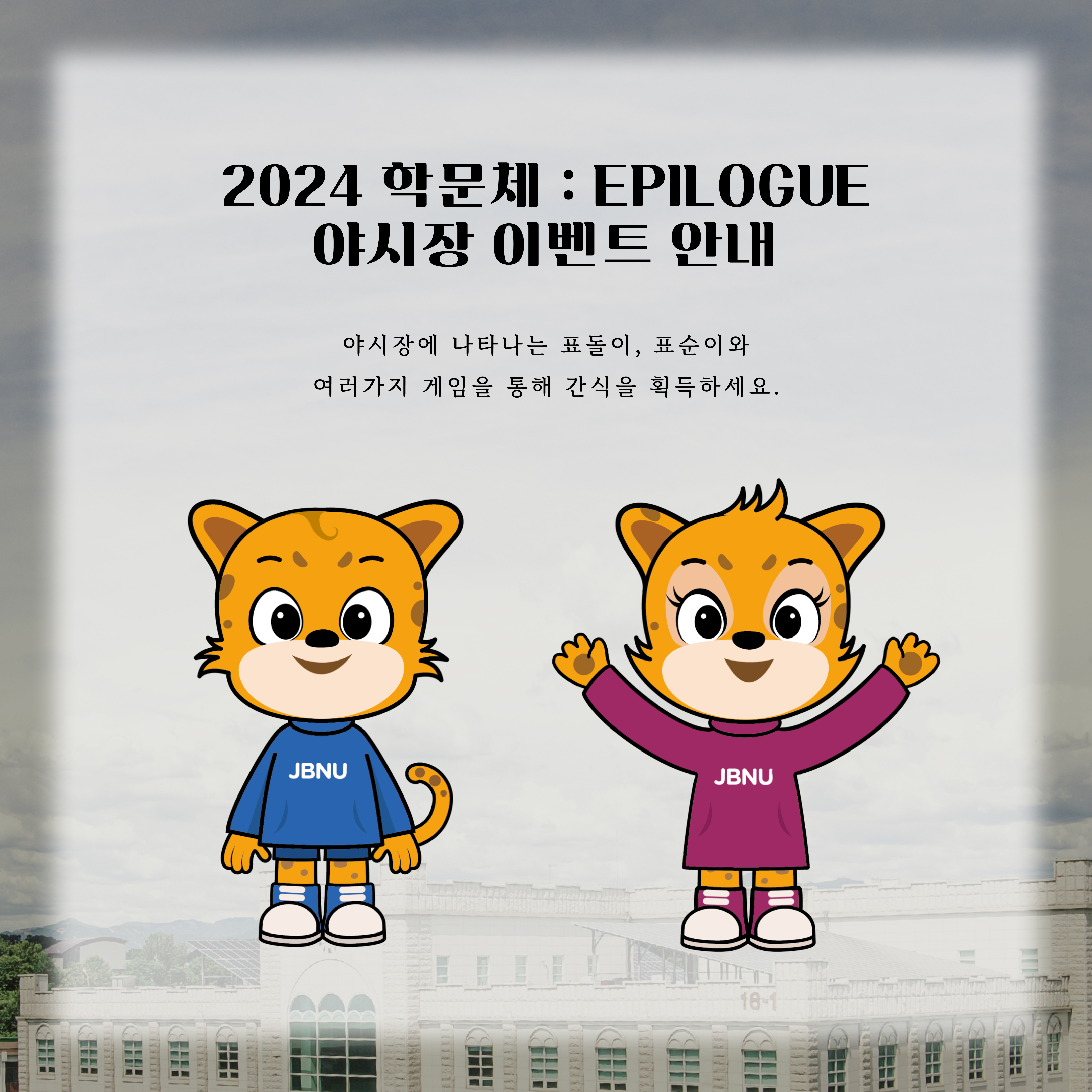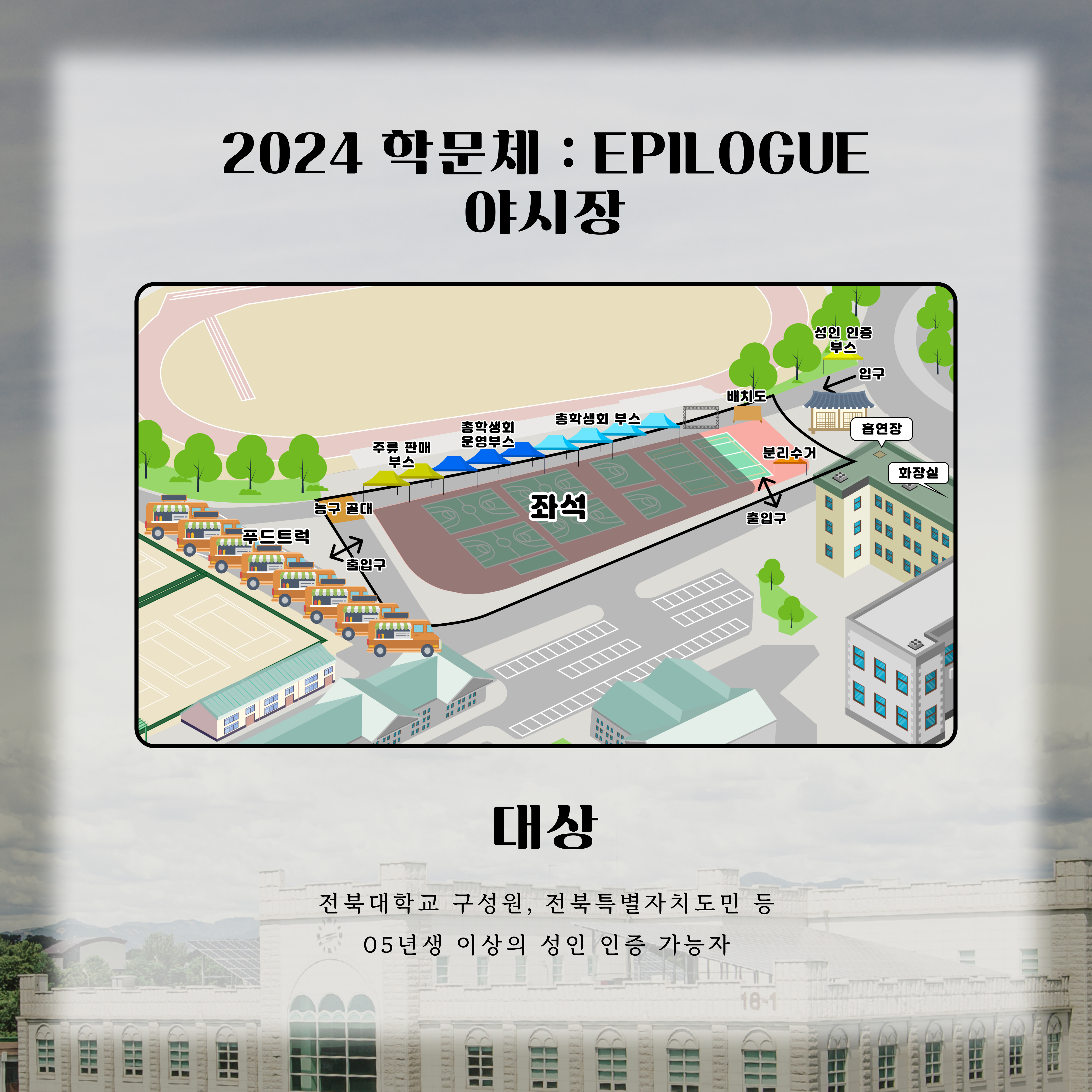 전북대학교 소운동장에서 진행되는 2024 학문체 : EPILOGUE 야시장의 타임테이블과 이벤트를 안내해드리겠습니다.