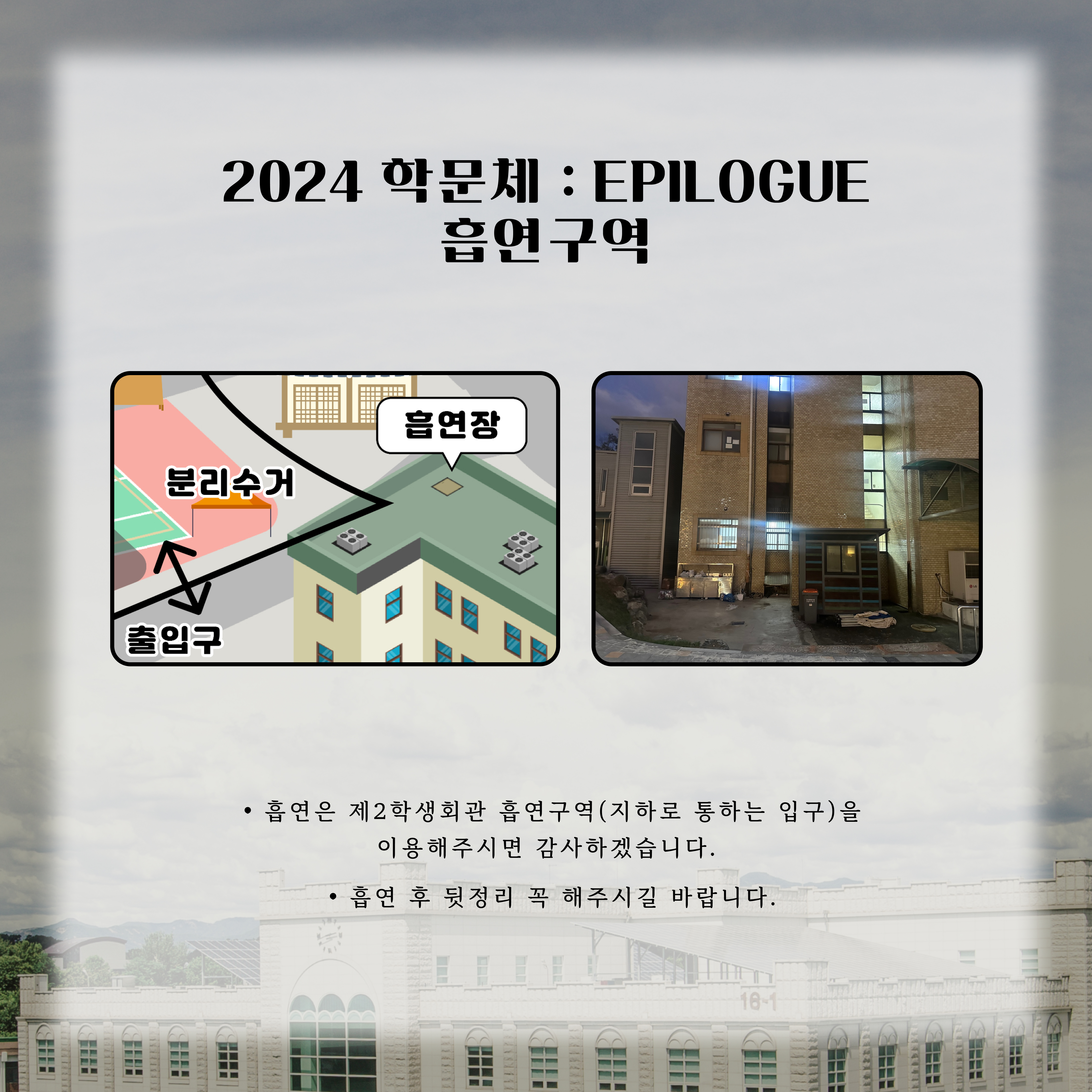 *흡연은 제2학생회관 흡연구역(지하로 통하는 입구)을 이용해주시면 감사하겠습니다.