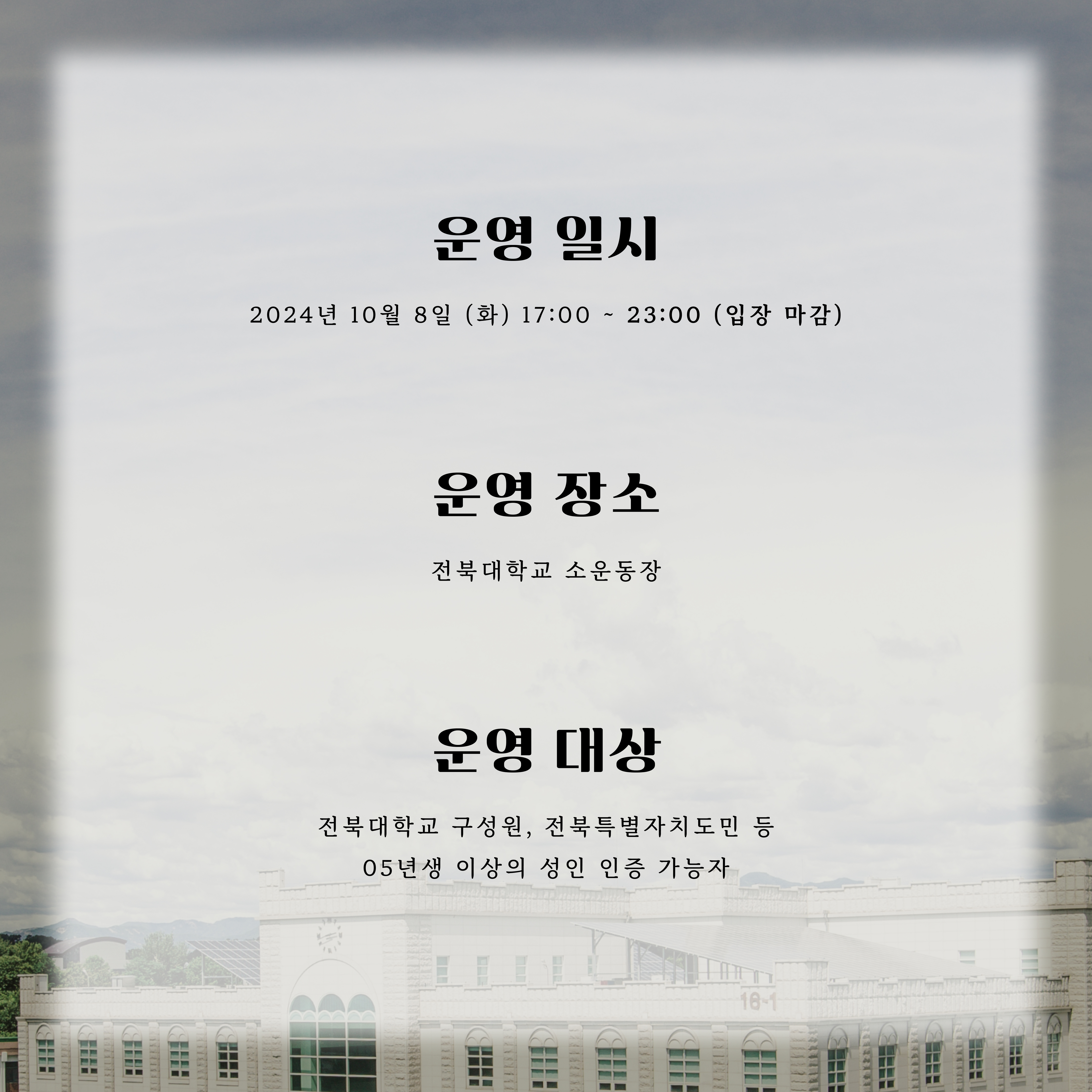 운영 일시: 2024년 10월 8일 (화) 17:00 ~ 23:00 (입장 마감)