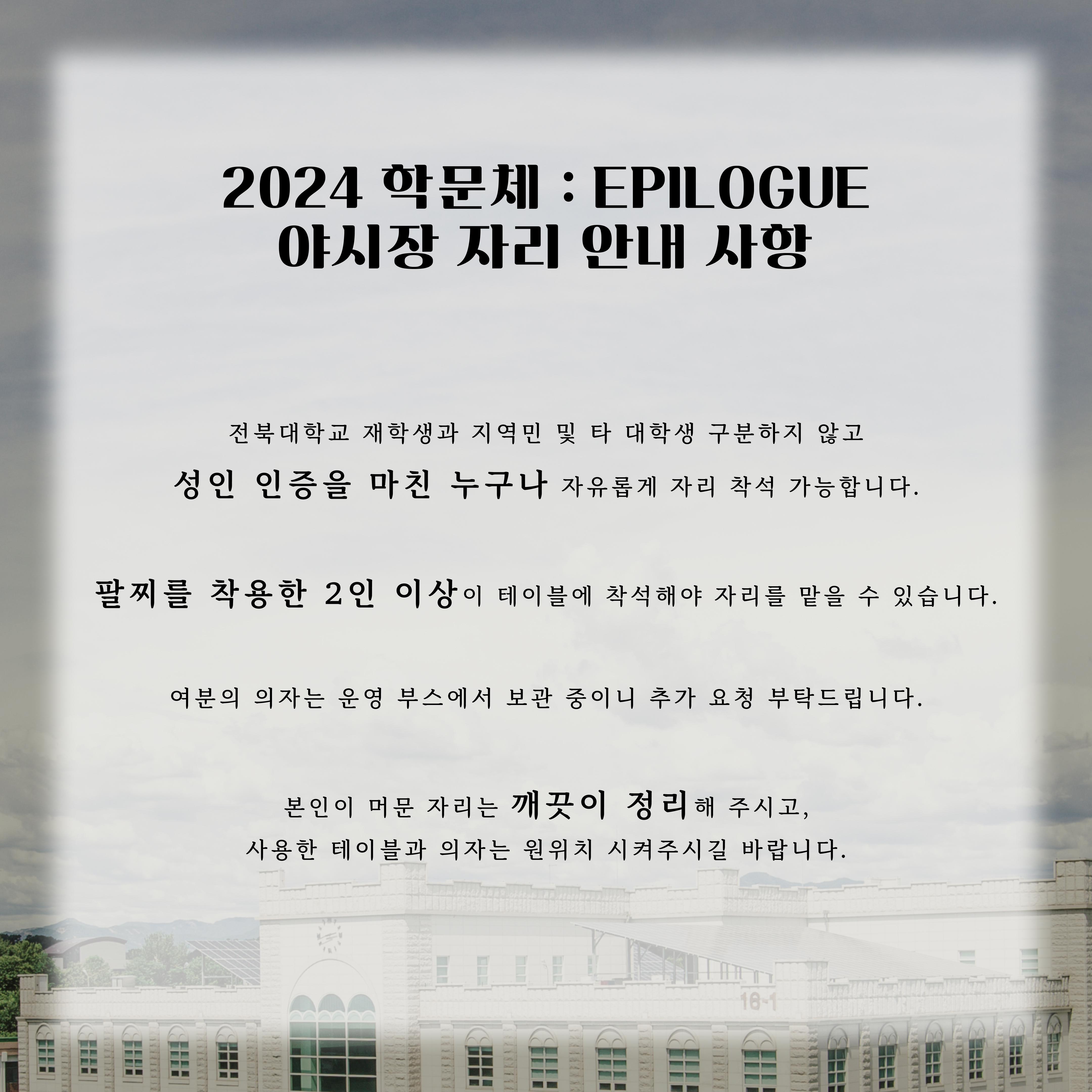 전북대학교 소운동장에서 진행되는 2024 학문체 : EPILOGUE 야시장의 유의사항을 안내해드리겠습니다.