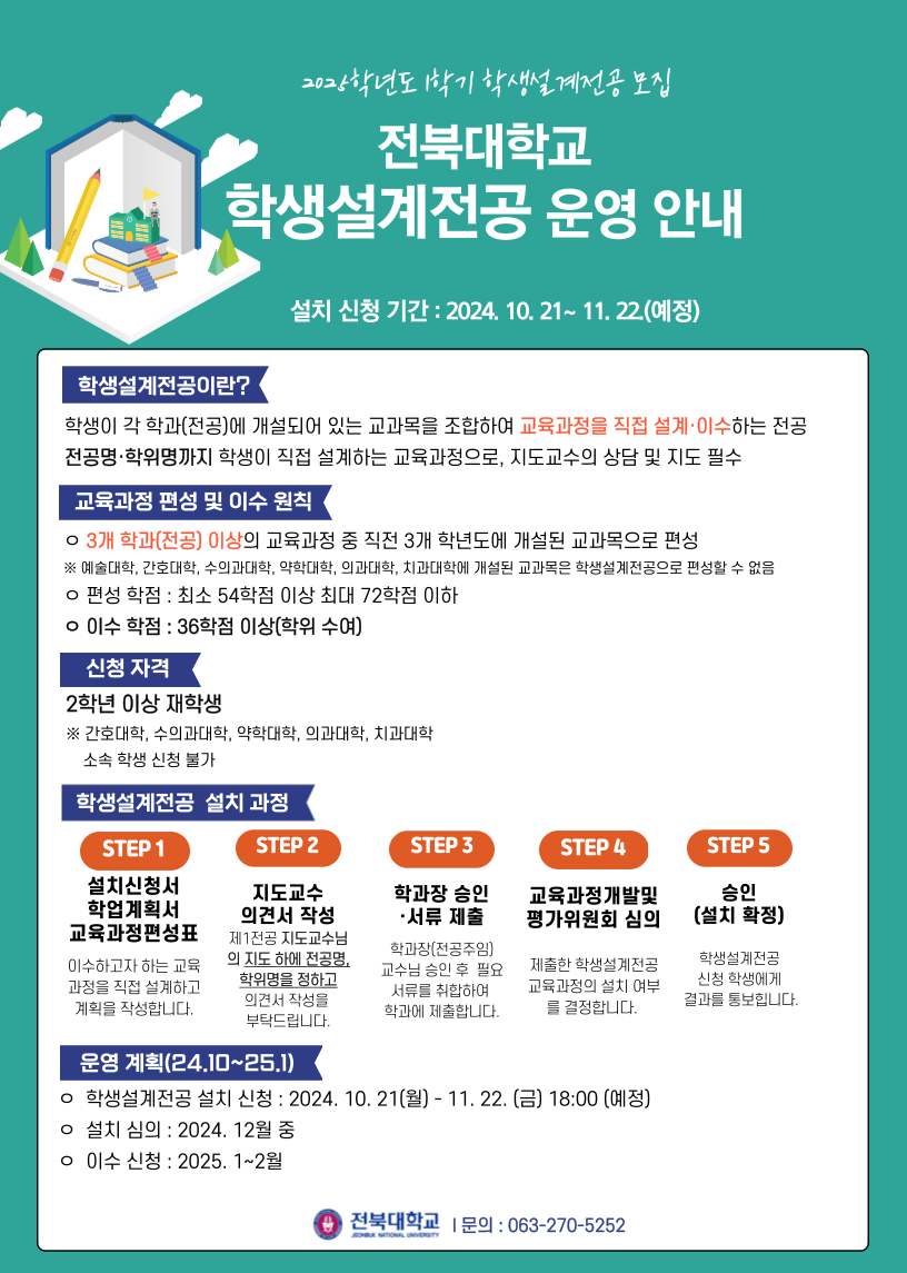 5. 학생설계전공 설치 신청 기간 : 2024. 10. 21(월) - 11. 22.(금) 18:00 (예정)