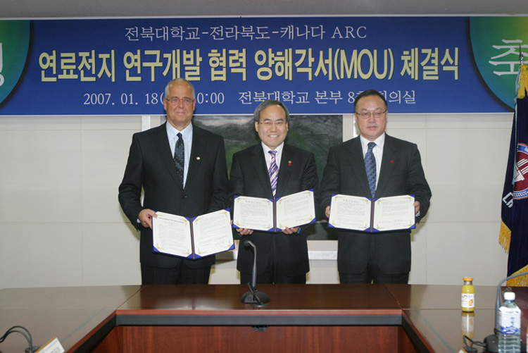 우리 대학(총장 서거석)과 전라북도, 캐나다 ARC 3개 기관이 수소 연료전지 연구개발 협력을 위한 양해각서(MOU)를 1월 18일(목) 오전 10시 대학 본부 8층 회의실에서 체결하였다.