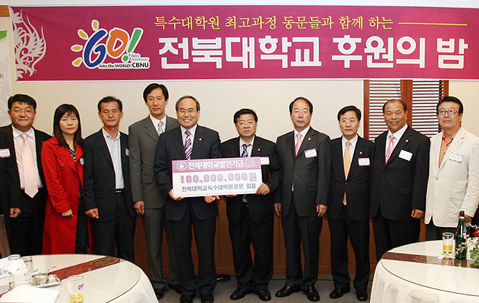 우리 대학 개교 60주년을 기념하여 10월 9일 열린 '후원의 밤' 행사에서 발전기금 1억원을 모금하여 서거석 총장에게 전달하였다.