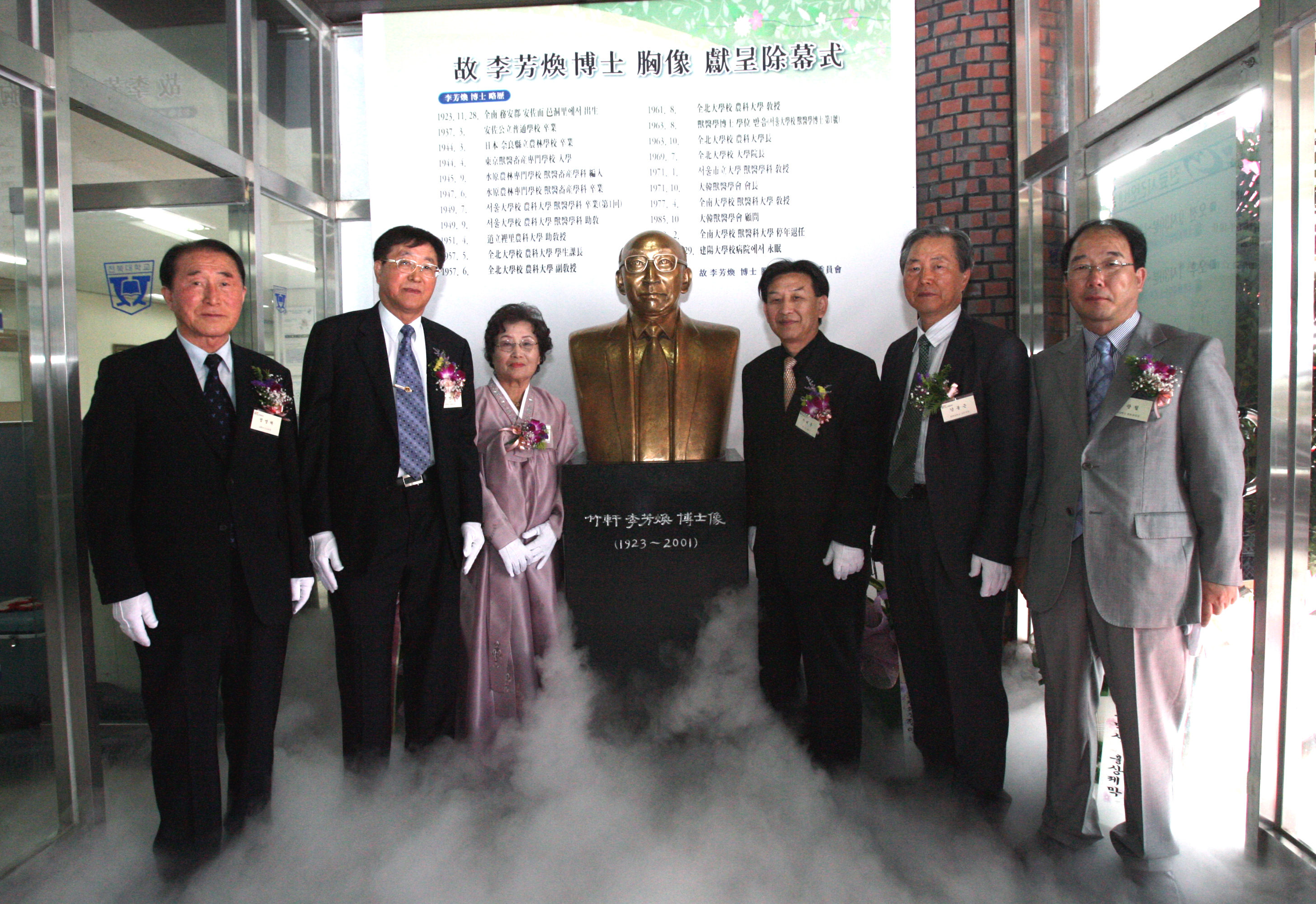 이번 흉상 제막식은 고 이방환 박사의 가르침을 받은 제자와 졸업생들이 자발적으로 추진위원회(위원장 백영기 전북대 명예교수)를 만들어 제자들의 따뜻한 모금만으로 이뤄진 것.