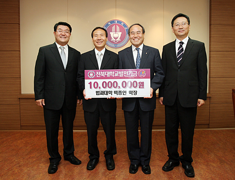 백 학장은 “우리 대학이 세계 100대 대학을 목표로 쉼없이 전진하는 모습에 작은 힘이나마 보태고 싶어 발전기금을 내게 됐다”라며 “이 작은 정성이 우리 대학이 세계적인 대학으로 성장하고, 첫 걸음을 앞둔 법학전문대학원이 전국 최고 수준의 로스쿨로 성장하는데 밑거름이 되길 바란다”라고 말했다.