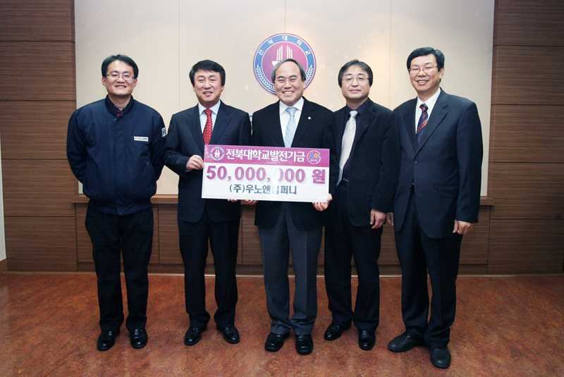 세계 가발용 원사 시장을 선도하고 있는 (주)우노앤컴퍼니(완주군 봉동읍 소재) 김종천(52ㆍ우리 대학 섬유공학 박사) 대표가 우리 대학에 발전기금 5천만 원을 쾌척했다.
