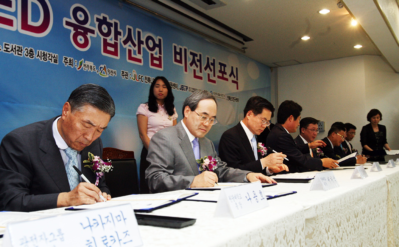 특히 우리대학은 익산캠퍼스에 자리잡은 LED융합기술지원센터를 2015년까지 전국 최대 농생명 LED융합산업을 선도하는 기지로 육성하기 위한 비전을 제시했고, 이를 위해 이날 전북도와 익산시, 농촌진흥청, 원광대, 일진소재산업, LG CNS, 동부그룹, 오디텍 등이 참여하는 산·학·관 협력 조인식도 가졌다.