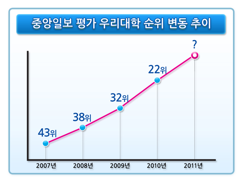 올 초 아시아대학 평가에서 전국 대학 중 14위에 랭크된 우리대학은 지난 9월 27일 발표된 중앙일보 대학평가에서도 지난해보다 10계단이나 상승했다.