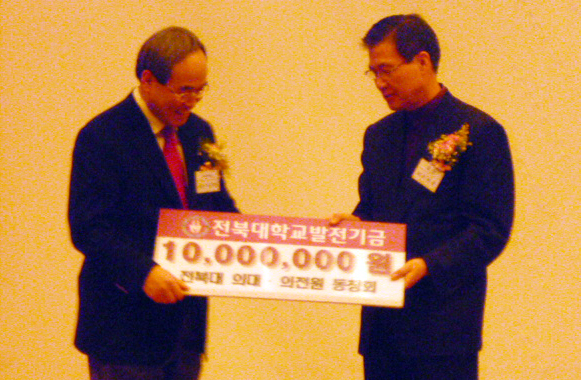 이날 의대·의전원 동창회는 모교의 경쟁력 향상을 위해 회원들의 마음을 모은 기금 1천만원을 서거석 총장에게 대학 경쟁력 향상 기금으로 전달하며 모교 사랑의 마음을 나눴다.