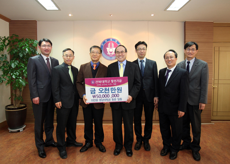 이날 발전기금을 기탁한 의전원 영상의학과 동문은 문무창 현대영상의학과의원 원장을 비롯해 양승문 익산중앙영상의학과의원 원장, 오종현 우주영상의학과의원 원장, 조호제 서울 안산방사선과의원장, 황승배 우리대학 의전원 영상의학과 교수 등 5명.