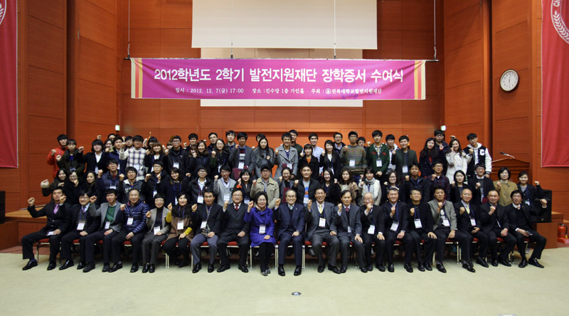 이날 행사에는 지난해와 올해 20억 원을 기탁한 목정 김광수 미래엔그룹 명예회장을 대신해 큰아들인 김홍식 전북도시가스 사장과 살아생전 대학과 제자들에 큰 사랑을 베풀었던 故류점호 교수(농생대)의 미망인인 오정옥 여사 등 기부자들과 서거석 총장을 비롯한 전북대 보직자 및 단과대학장, 김수곤 전 총장, 정병하 총동창회장, 김정태 기성회장, 이용재 재경동문회장 겸 발전후원회장 등 200여 명이 참석해 감사의 마음을 나눴다.