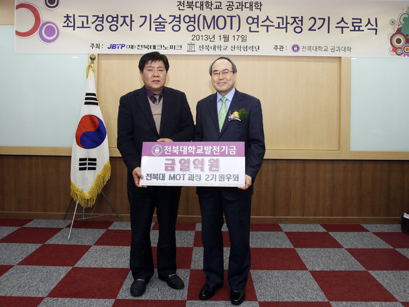 이 자리에서 양경식 원우회장은 “전북대 MOT 과정을 통해 기업인으로서 급변하는 세계 경영환경 속에서 글로벌 시장을 리드할 수 있는 창의적인 시야를 넓힐 수 있었다”며 “원우들의 뜻이 모아진 이 기금이 글로벌 명문으로 도약하고 있는 전북대 발전에 조금이나마 기여할 수 있기를 바란다”고 말했다.