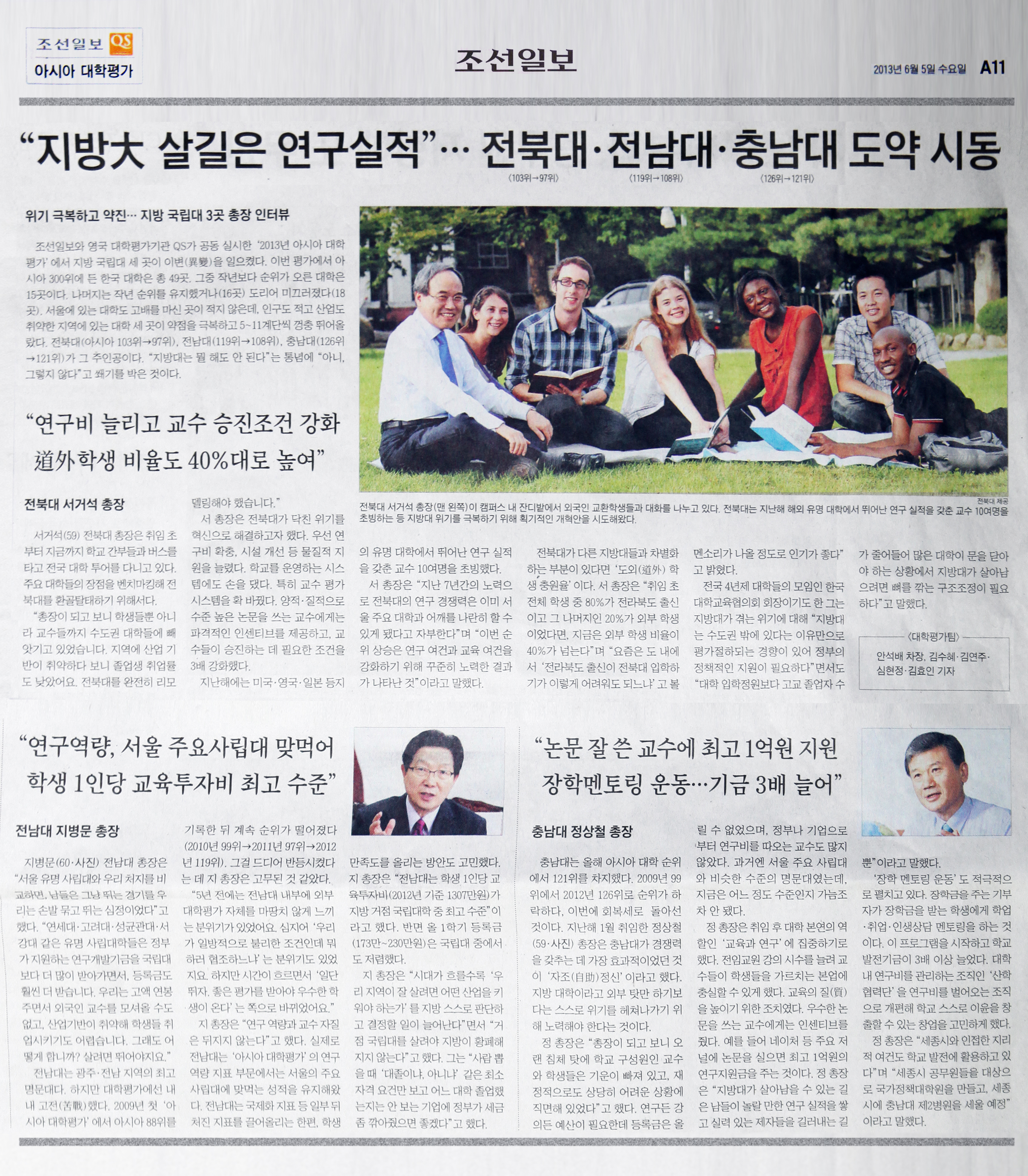 조선일보와 영국의 글로벌대학평가기관 QS가 공동으로 실시한 2013 아시아대학평가 결과가 발표됐던 지난 6월 5일, 조선일보는 사회면(11면) 메인 기사를 통해 이 평가에서 아시아 Top100(97위)에 오른 우리대학을 위와 같이 집중 조명했다.
