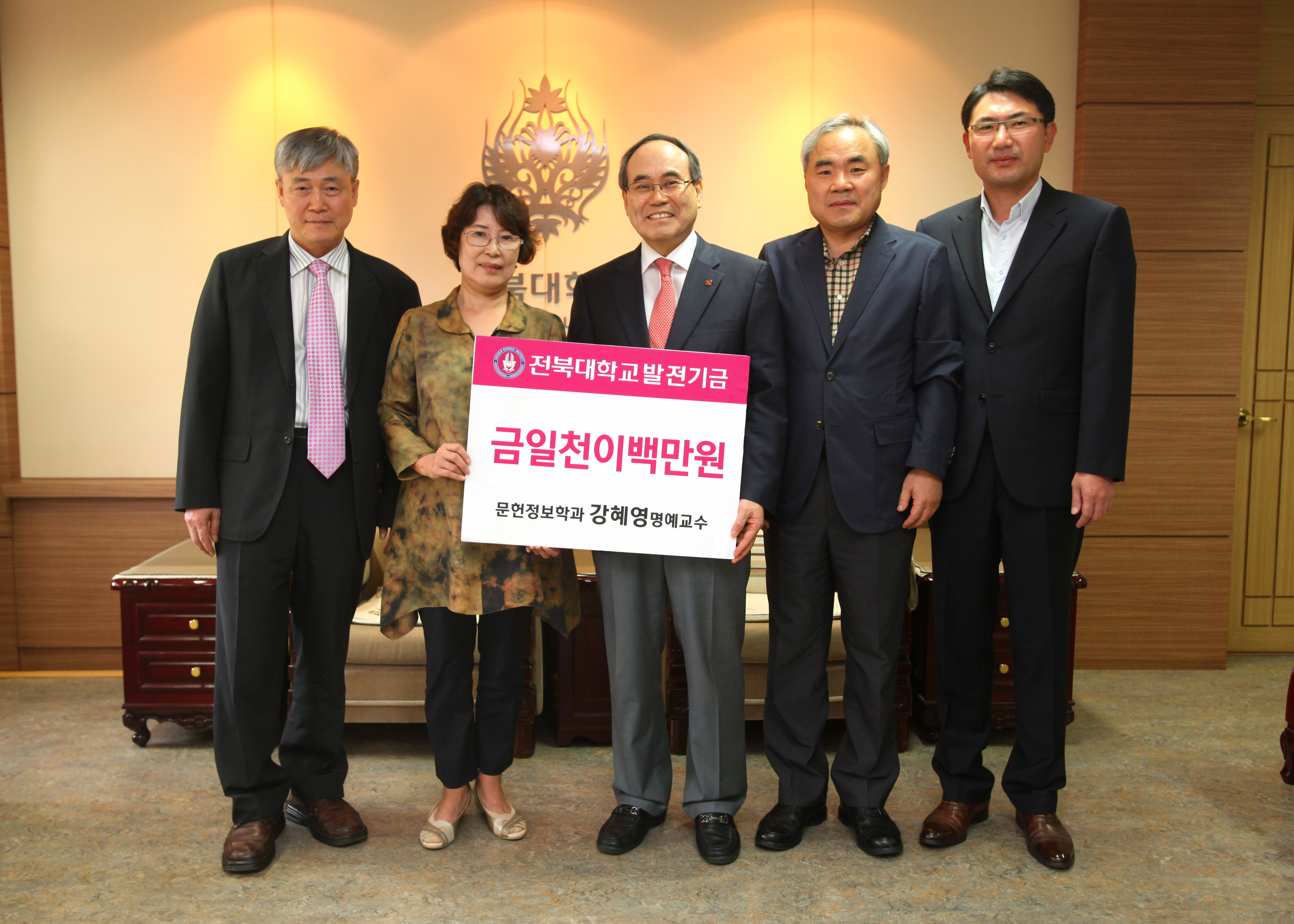 지난 8월 31일자로 정년퇴임한 강혜영 명예교수(인문대 문헌정보학과)가 9월 12일 서거석 총장을 찾아 후학 양성을 위해 써달라며 발전기금 1,200만원을 기탁했다.