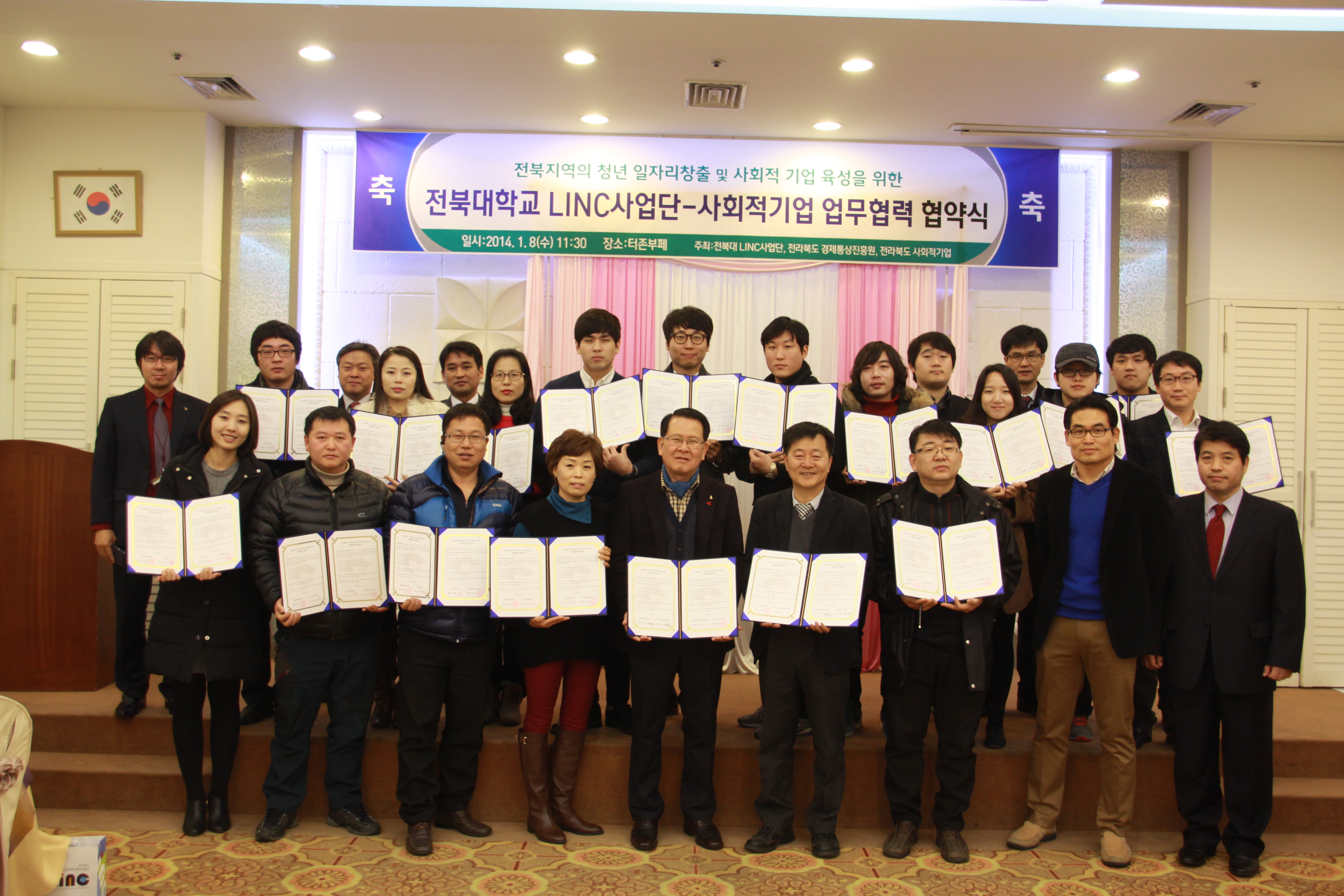 이를 위해 LINC 사업단은 1월 8일 오전 11시 30분 전북경제통상진흥원을 비롯 제이온, 옷깃, 예담공예 등 전북지역 15개 사회적 기업과 협약식을 갖고 지속적인 교류를 약속했다.
