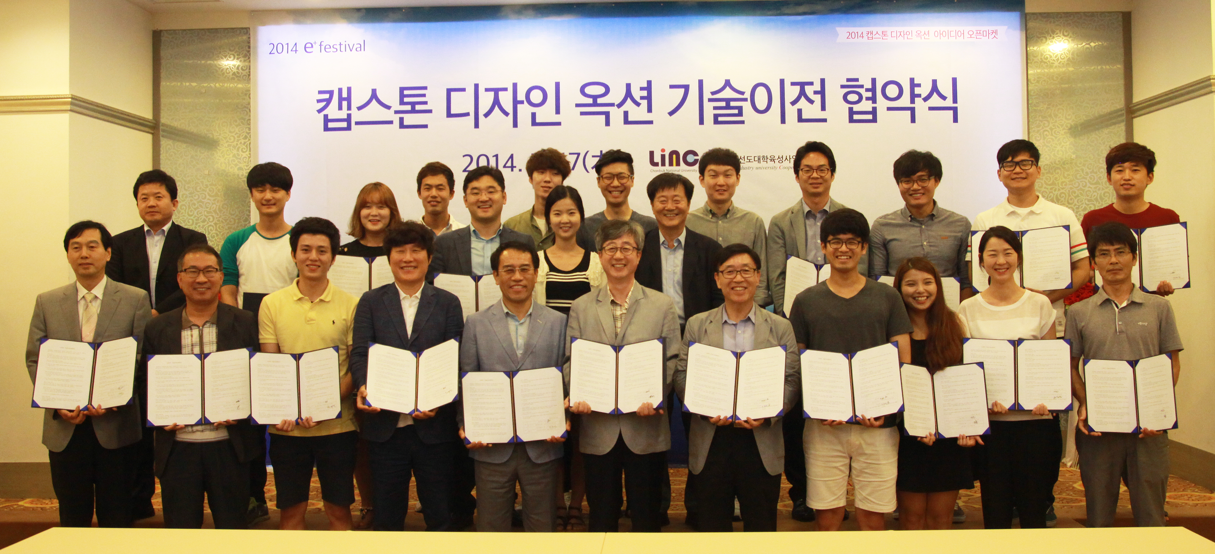 이에 우리대학은 지난 7월 17일 오후 5시 ㈜바로텍시너지와 칼릭스전자화학(주), 비나텍(주), (주)금성광에너지 등 12개 기업과 아이디어를 낸 학생, LINC사업단 및 공학교육혁신센터 관계자들이 참석한 가운데 기술이전 협약식을 가졌다.