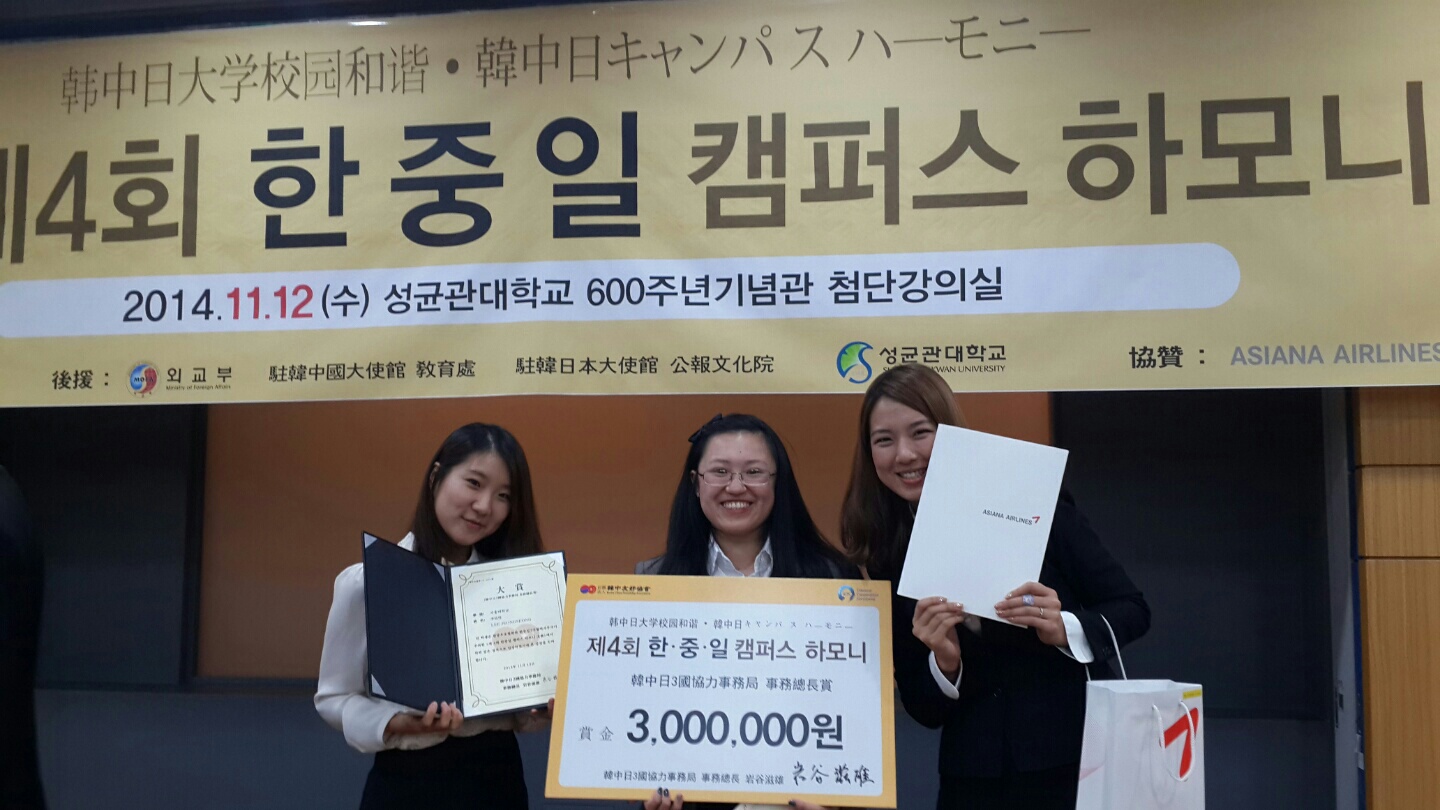 홍콩 유학생인 챈비키 학생(국제학부 2년)과 일본 유학생인 야마구치 유미 학생(국어국문학과 3년)은 지난 11월 12일 열린 한중일 캠퍼스 하모니 대회에서 ‘다문화 가정을 통한 한․중․일 삼국의 협력’이라는 주제 발표를 통해 대상의 영예를 안았다.