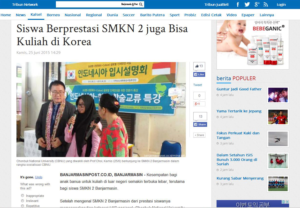 이 매체는 ‘제2공립기술고교의 실력 있는 학생들도 한국에서 공부할 수 있다’라는 제하의 기사를 통해 “전북대의 이 학교 방문은 인도네시아에서 처음 있는 일”이라고 말한 뒤, 무나와르 교장의 말을 인용해 “우리 학교는 전북대 방문이라는 기회를 누린 인도네시아 유일의 고등학교”라고 이번 설명회를 집중 조명했다.