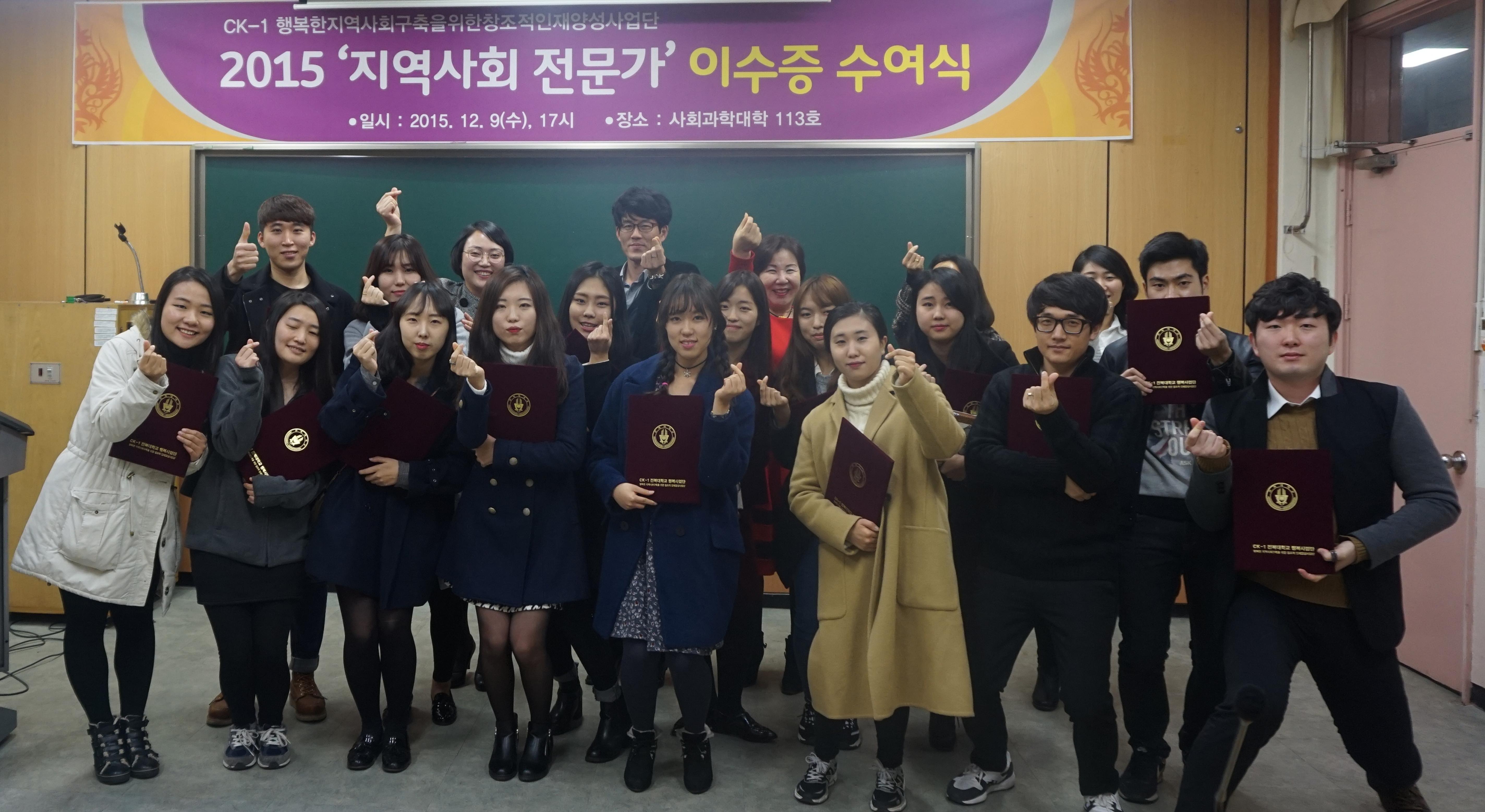 대학 특성화사업 선정을 통해 운영되고 있는 우리대학 행복한지역사회구축을위한창조적인재양성사업단(단장 윤명숙·이하 행복사업단)이 지역사회 전문가 양성을 위한 교육과정을 개설해 첫 수료자를 배출하는 성과를 올렸다.