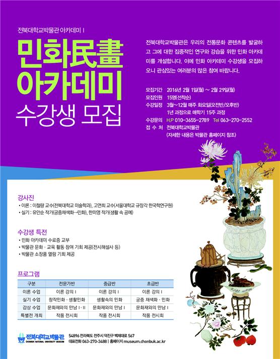 박물관 민화 아카데미의 수강을 원하는 사람은 오는 2월 29일까지 박물관으로 신청하면 된다. 자세한 문의는 전화(063-270-2552)나 박물관 홈페이지(http://museum.jbnu.ac.kr/) ‘새소식’ 참조하면 된다. 수강료는 유료.