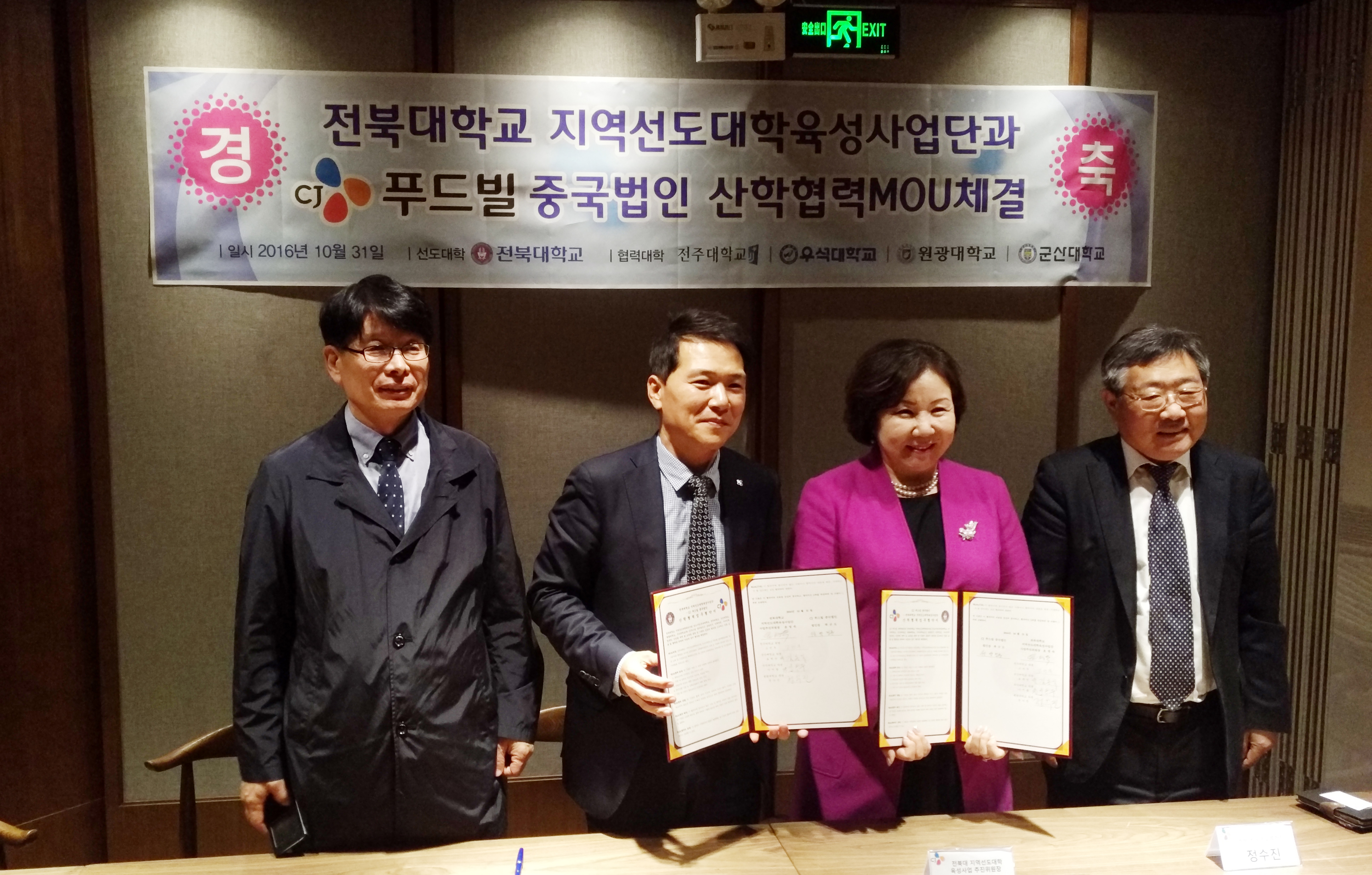 지난 10월 31일 중국 상해 정안사 비비고 매장에서 개최된 MOU 협약식에는 CJ 상해대표처 박은모 수석대표, 박정훈 화동지역 법인장과 윤명숙 전북대 지역선도대학육성사업추진위원장, 정수진 원광대 국제교류처장, 김동익 군산대 산학협력단장이 참여한 가운데 식품관련학과, 경영마케팅, 디자인 분야의 학생들을 취업까지 연계시키는 프로그램을 추진하기로 하였다.