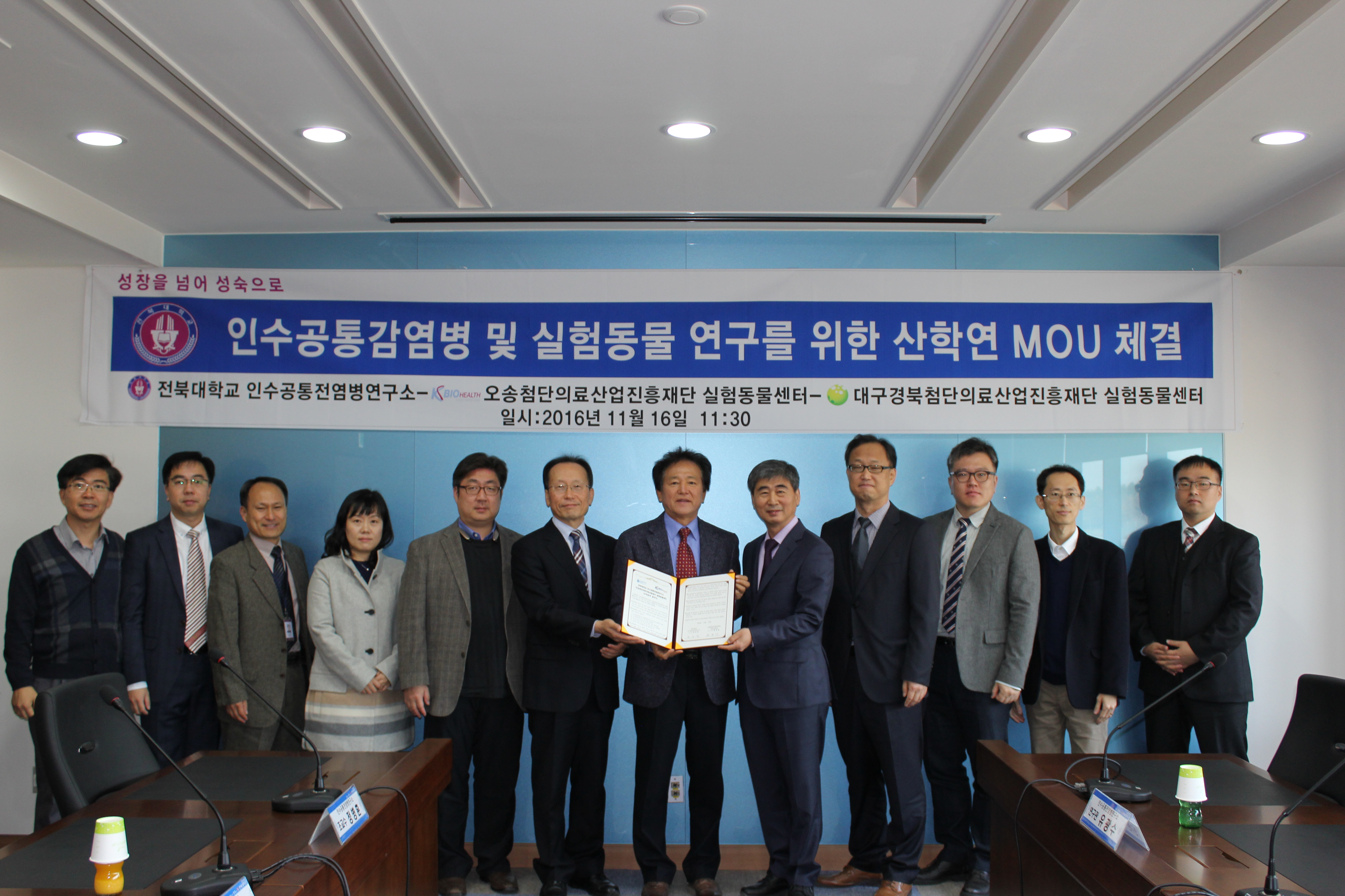 연구소는 16일 오전 국방부 의무사령부 산하 국군의학연구소(소장 박규은), 오송첨단의료산업진흥재단 실험동물센터(센터장 현병환)와 대구경북첨단의료산업진흥재단 실험동물센터(센터장 김충용) 등과 3자간 MOU를 체결했다.