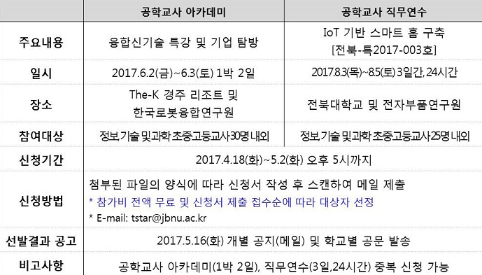 우리대학 청소년 창의기술인재센터에서는 공학과 관련된 새로운 이슈와 교육방법을 지원하고 기업가 정신 및 최신공학기술 확산을 통한 학생 간접교육을 위해 공학교사 아카데미 및 직무연수를 마련, 참여 교사를 모집한다.