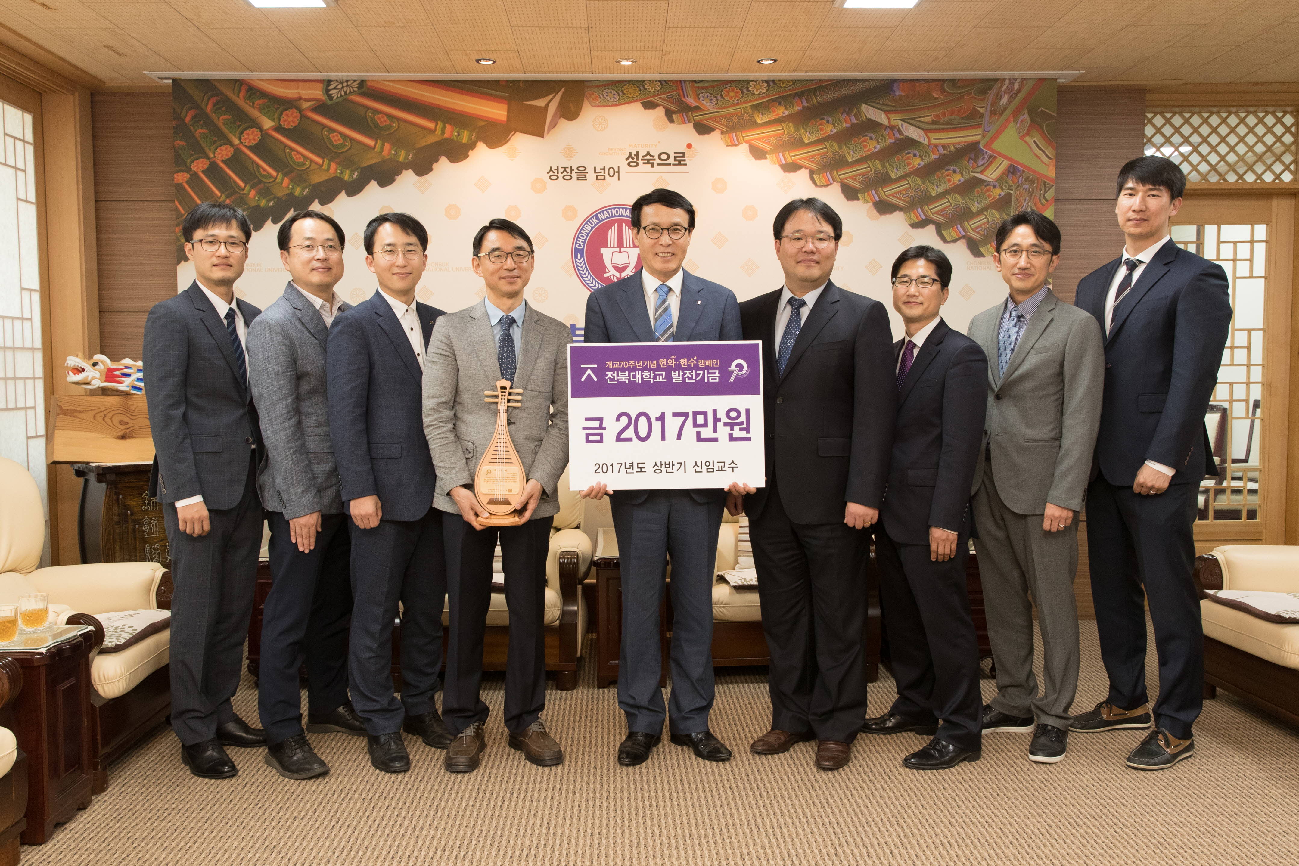 올해 신임 교수로 임용된 9명의 교수들이 대학 발전과 개교 70주년을 기념하기 위해 2,017만 원의 발전기금을 기탁했다.