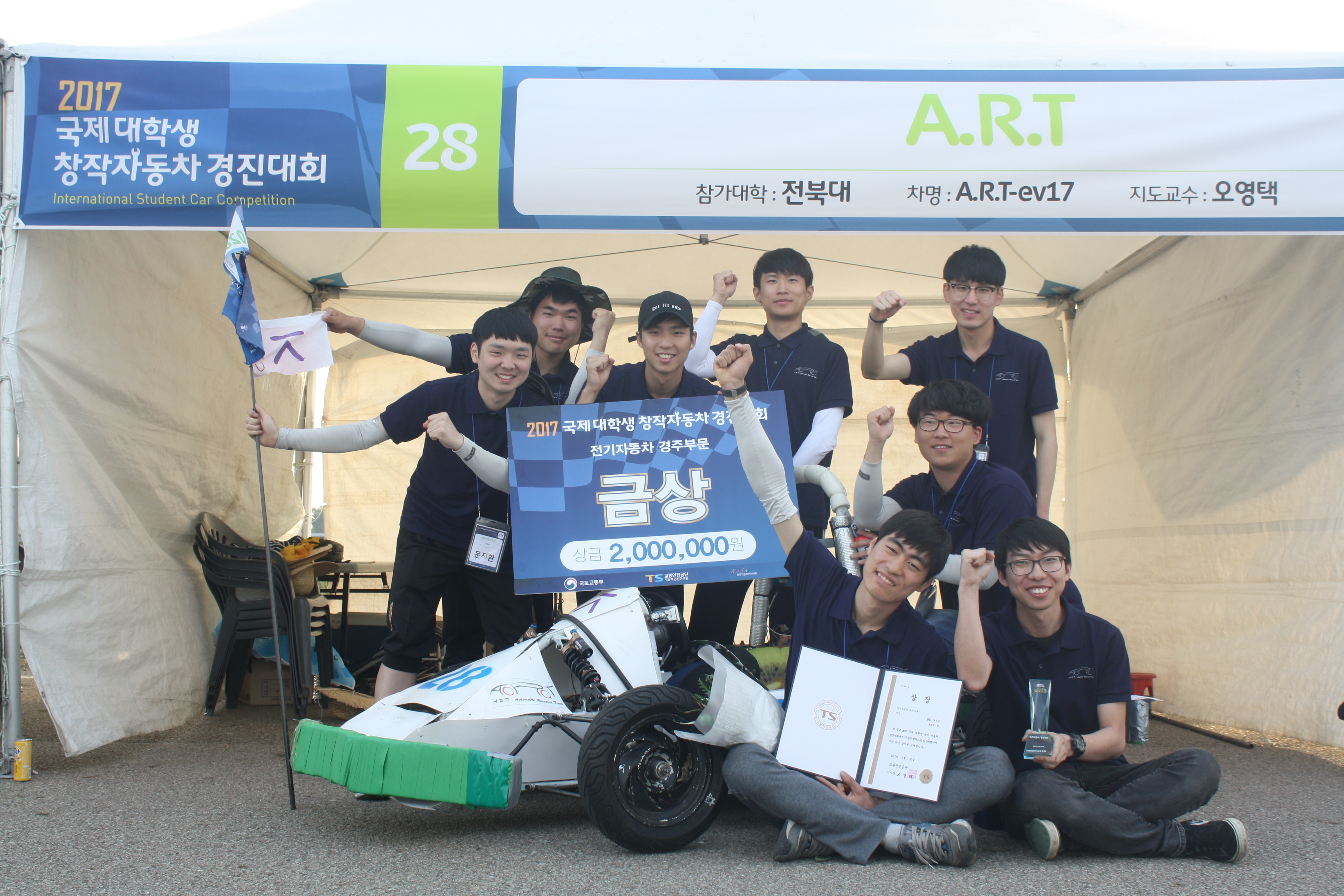 우리대학 공대 자작 자동차 동아리 ‘A.R.T-ev17(Automobile Research Team·지도교수 오영택)’ 학생들이 최근 경기도 화성에 소재한 자동차안전연구원에서 열린 '2017 국제 대학생 창작자동차 경진대회'에서 금상을 수상했다.