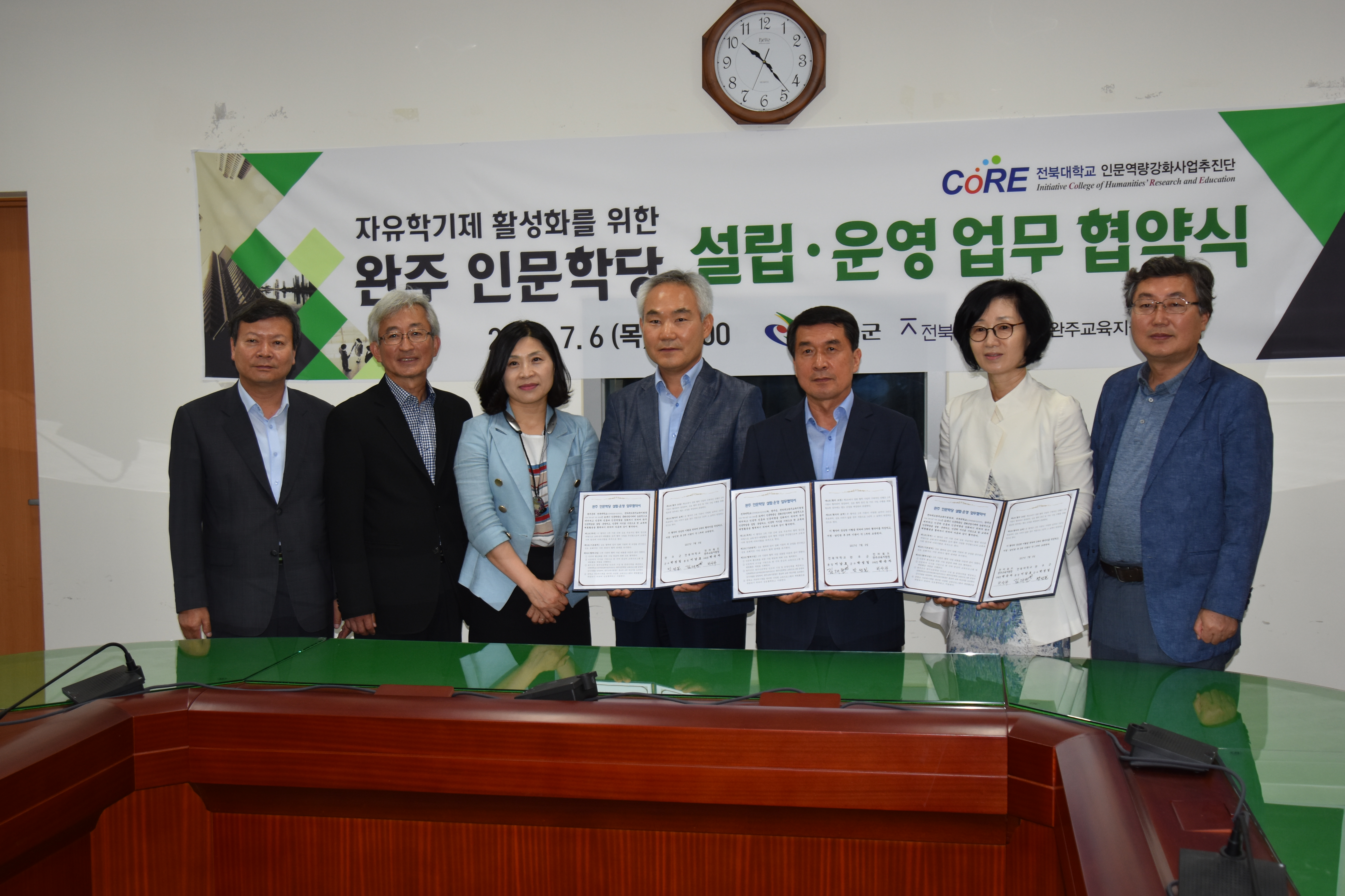이를 위해 코어사업단과 완주군, 완주교육지원청은 7월 6일 완주군청 4층 회의실에서 박성일 완주군수와 김재민 부총장, 이종민 전북대 코어사업단장 등이 참석한 가운데 운영 협력을 위한 협약을 체결했다.