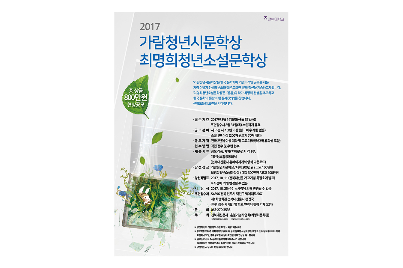 올해로 17회째 맞은 문학상은 김경주·이혜미·조율·이서령 시인과, 손홍규·전아리·김학찬·이갑수 소설가 등 굵직한 신예를 발굴하며 명실상부한 문학인 등용문으로 자리 잡았다. 문학상 공모와 관련한 자세한 문의는 전북대신문방송사(063-270-3536)로 하면 된다.