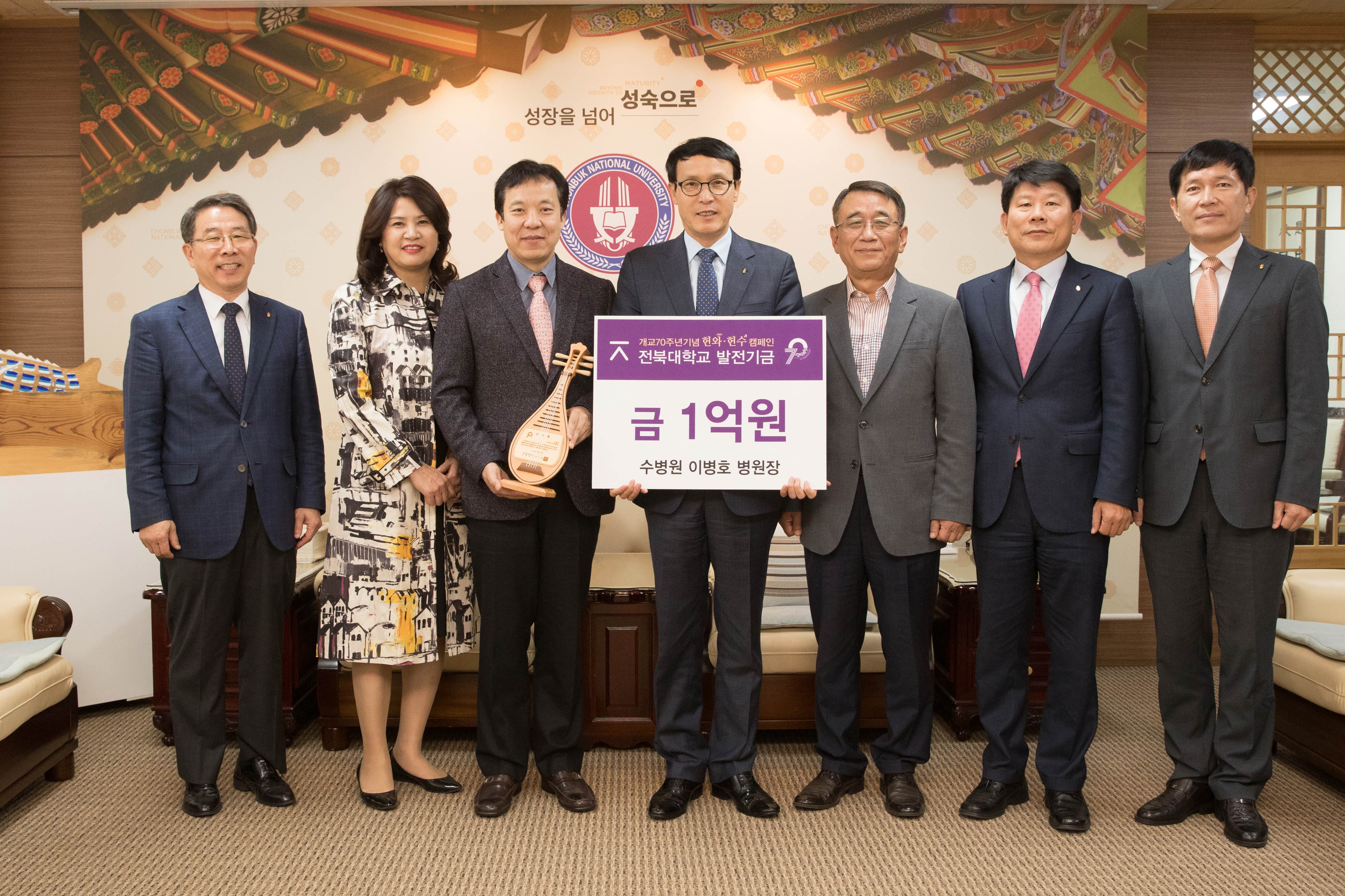 전주 수병원 이병호 원장(의학과 84학번)이 대학발전을 위해 써달라며 1억 원의 발전기금을 기탁했다.