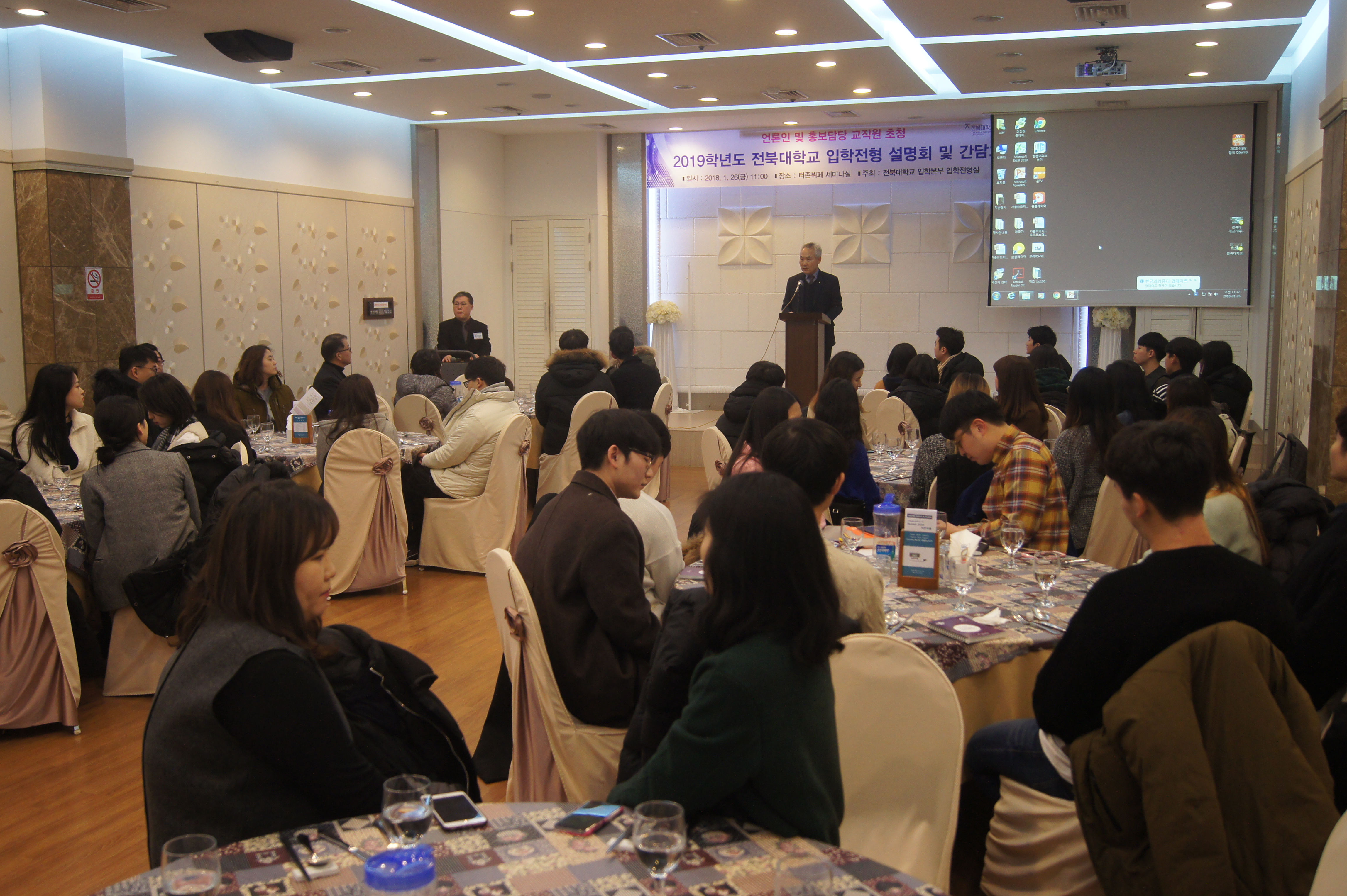이남호 총장과 입학본부 관계자해 언론인, 대학 교직원, 전공알림단 학생 등 100여 명이 참석한 가운데 열린 이날 간담회에서는 2019학년도 전북대 입학전형 설명과 의견 수렴 등의 순으로 진행됐다.