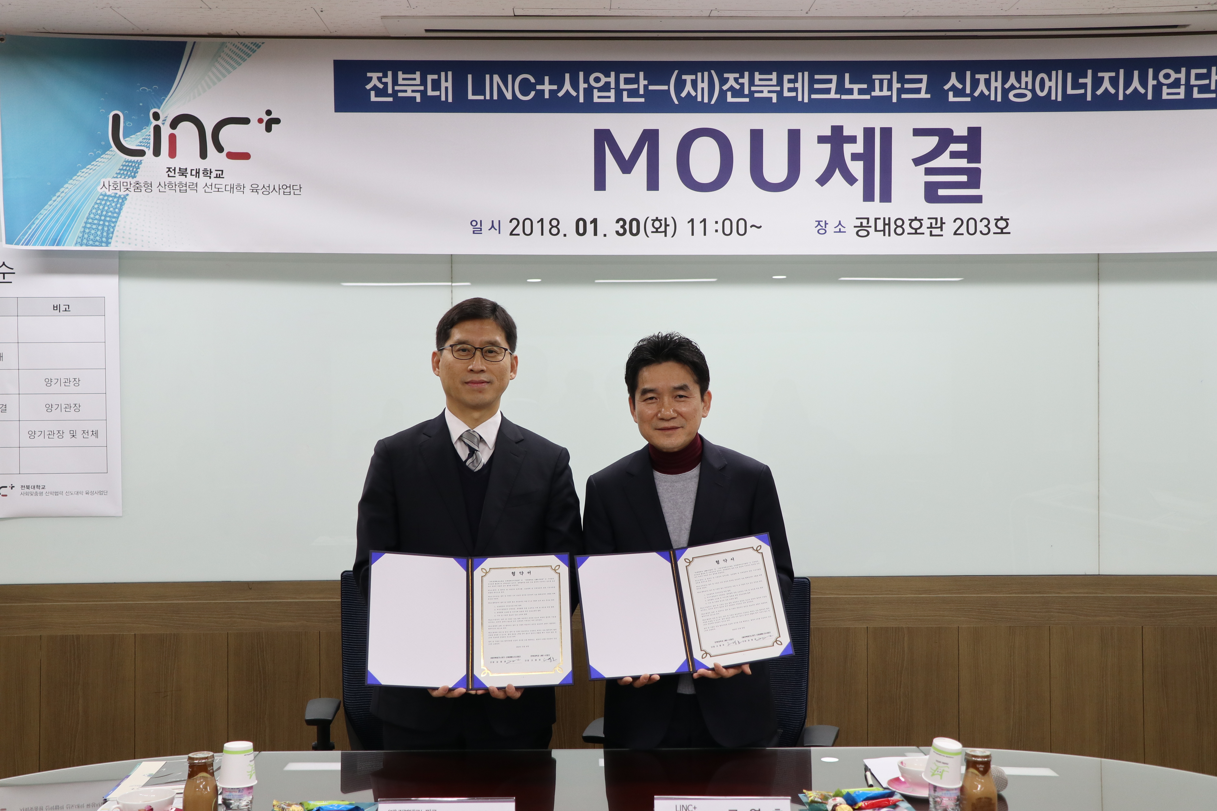 우리대학 LINC+사업단(단장 고영호)과 (재)전북테크노파크 신재생에너지사업단과(단장 김영권)이 지역산업 발전과 산학협력활성화를 위해 손을 맞잡았다.