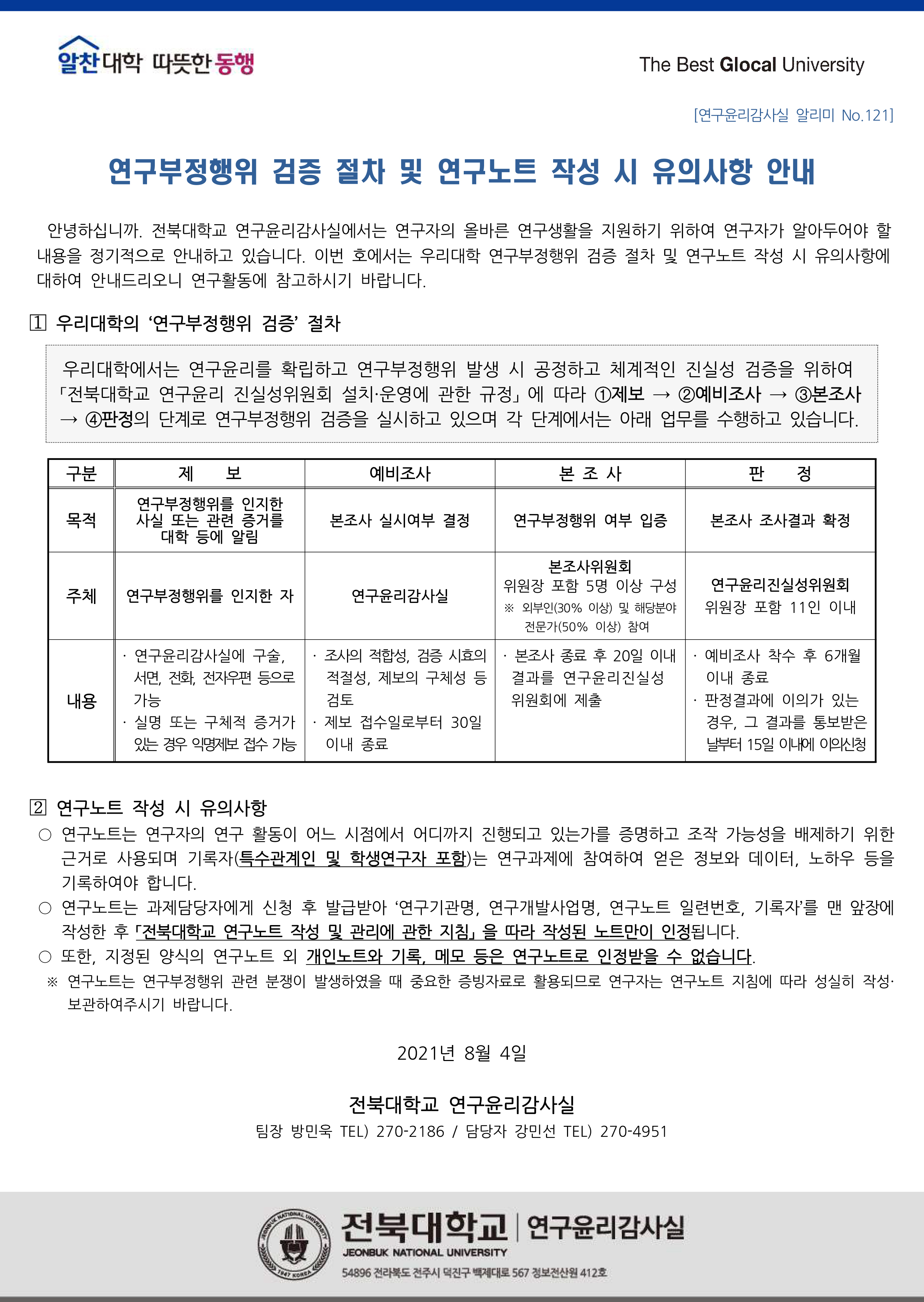 이번 121호에는 연구부정행위 검증 절차 및 연구노트 작성 시 유의사항 등이 안내되어 있다.