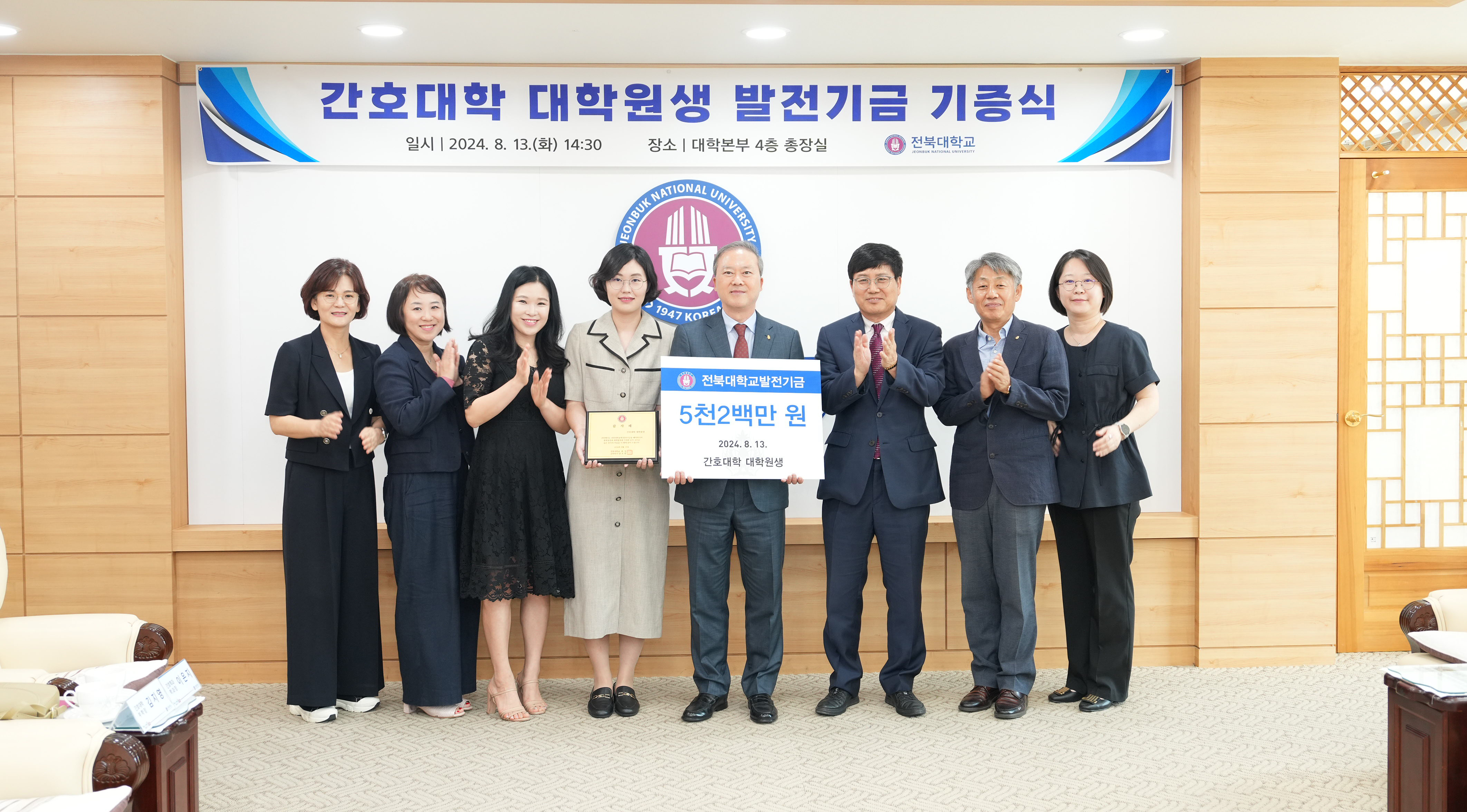 전북대학교(총장 양오봉) 간호대학 대학원생 34명이 대학 발전을 위해 써 달라며 발전기금 5천2백만 원을 기부했다.